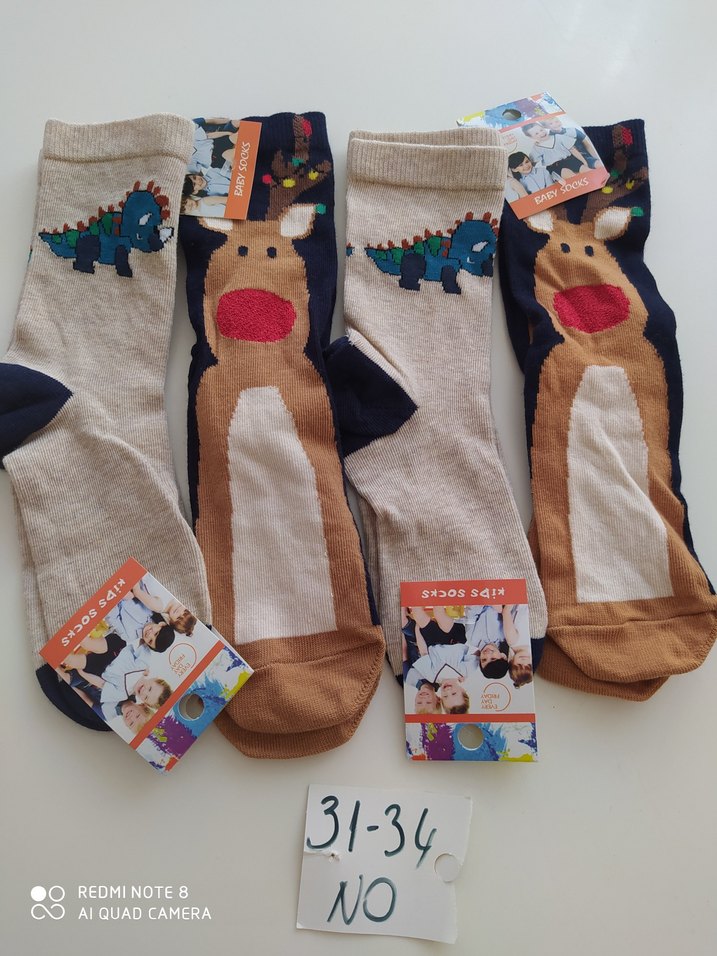 Renkli baskılı erkek çocuk çorapları, kahverengi tonlarında dinozor ve geyik desenli, 31-34 numara.