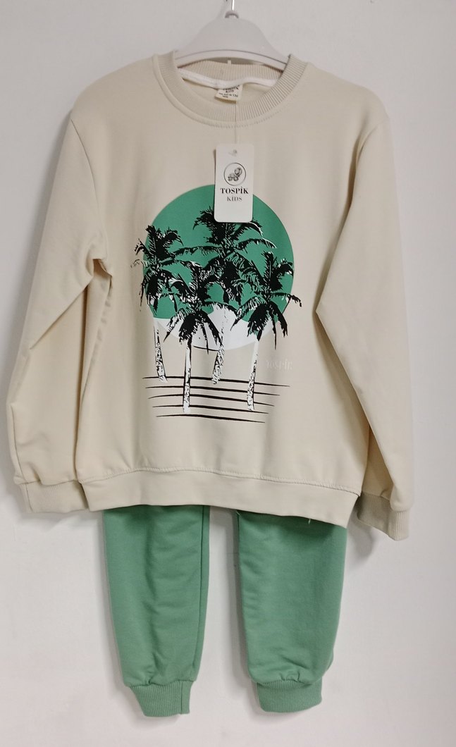 Bol kesim erkek çocuk uzun kollu sweatshirt ve yeşil eşofman takımı, yuvarlak yaka ve palmiyeli baskı detayına sahiptir. Yumuşak ve sıcak kumaştan üretilmiştir. 8,9 yas
