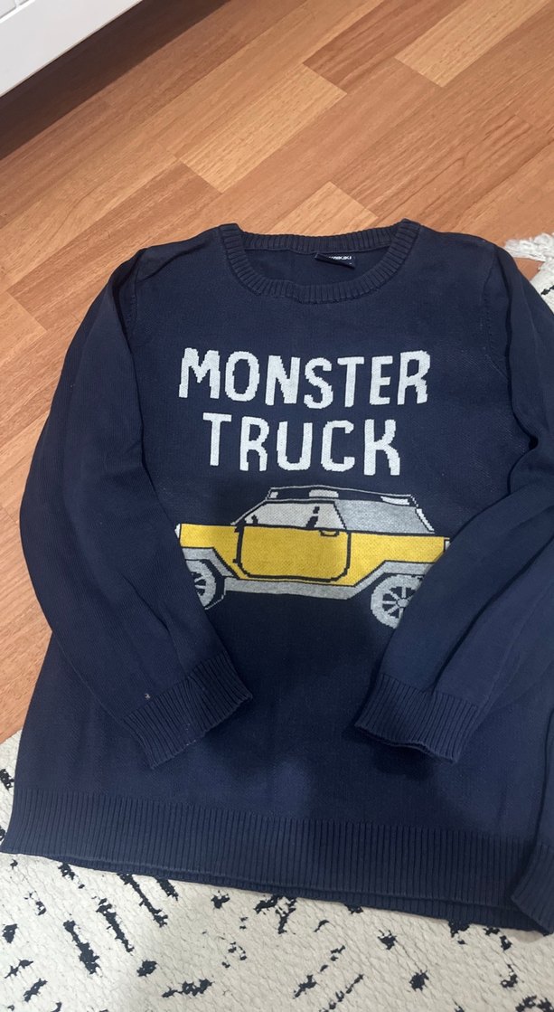 Uzun kollu, bisiklet yaka ve triko kumaştan yapılmış erkek çocuk sweatshirt. Koyu mavi renkte, önünde canavar kamyon baskısı bulunur. Trendy günlük stil için uygun.