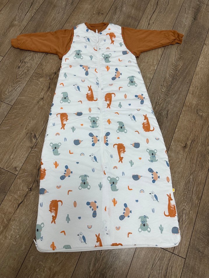 Erkek çocuklar için uzun kollu, fermuarlı ve bol kesim uyku tulumu. Pastel renklerde hayvan desenleriyle süslenmiş, kahverengi kollu ve straplez yakalı.
