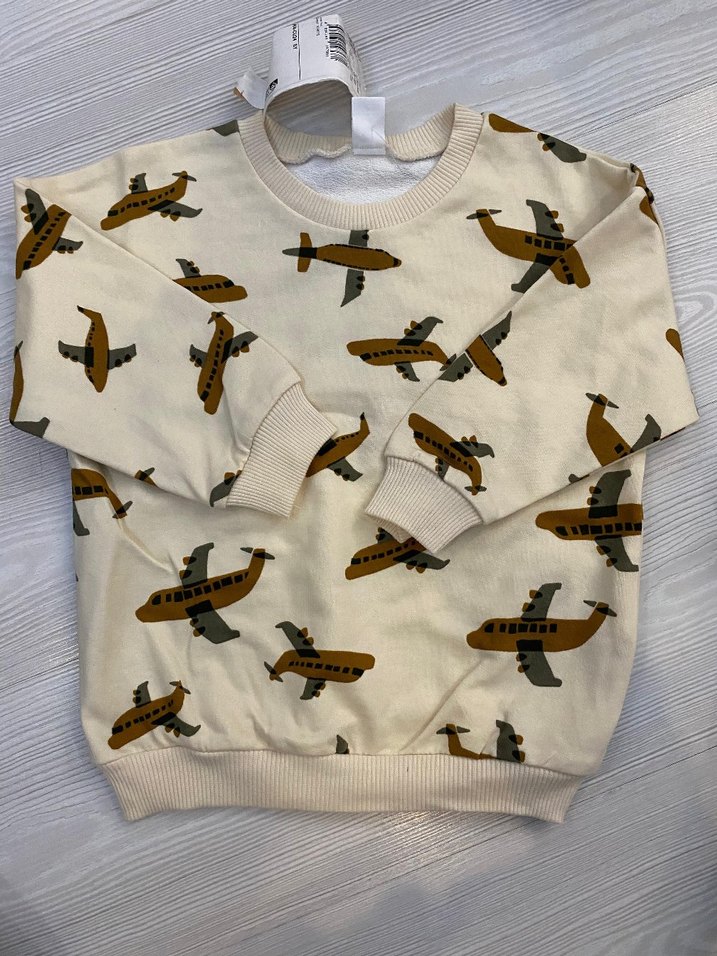 Erkek çocuklar için, hafif kahverengi uçak baskılı, yumuşak ve örgü dokulu kumaştan yapılmış, bol kesim ve bisiklet yaka uzun kollu sweatshirt. ✈️