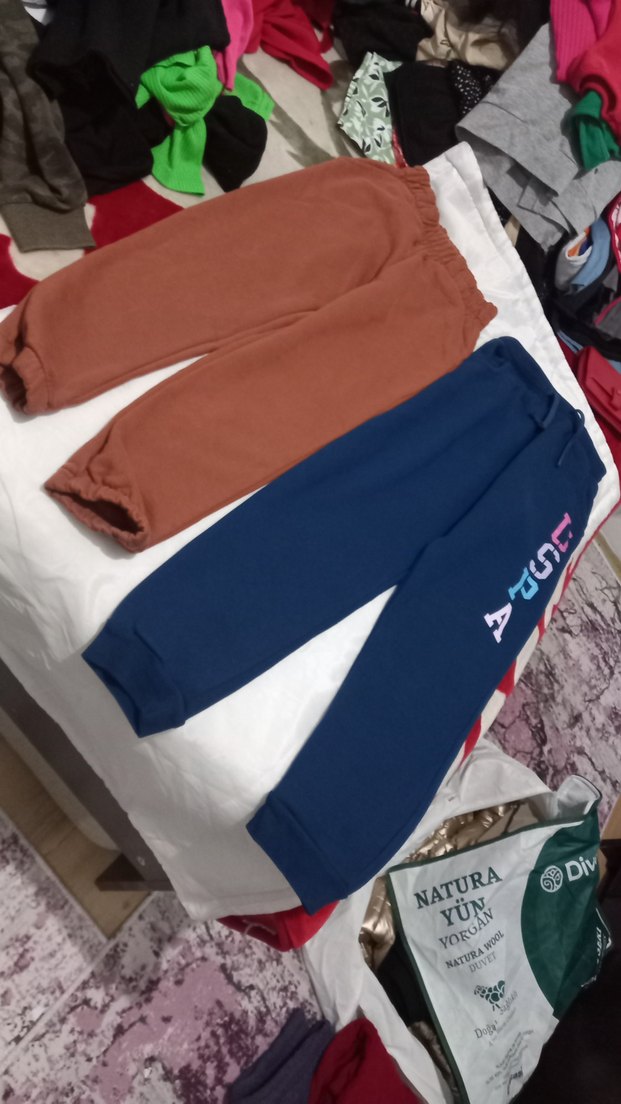 Erkek çocuklar için yumuşak kumaştan, bol kesim iki adet sweatpant. Biri kahverengi, diğeri baskılı mavi, elastik paçalı, rahat sokak stiline uygun. ♂️