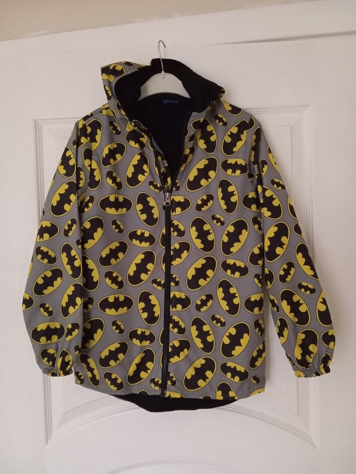 Erkek çocuklar için fermuarlı, bol kesim, yakalı ve yumuşak fleece kumaştan yapılmış gri zemin üzerine sarı Batman desenli yağmurluk. ️