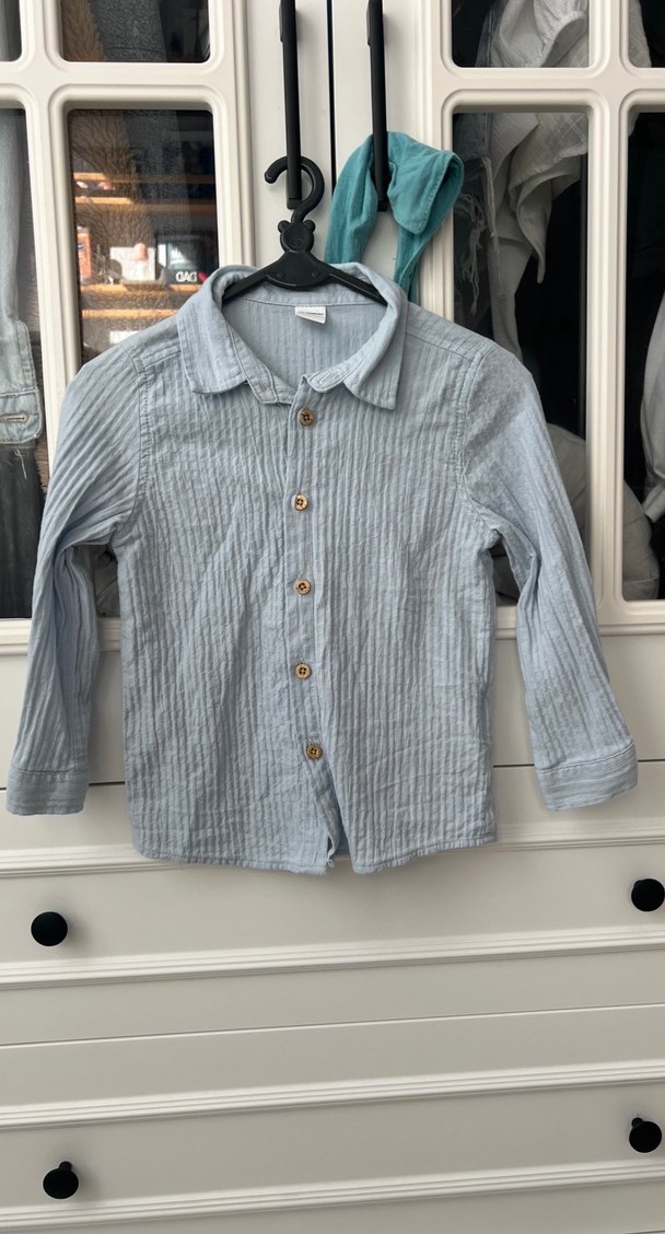 Erkek çocuk için mavi renkte, keten kumaştan uzun kollu ve yaka detaylı, düğmeli önü olan regular fit gömlek.