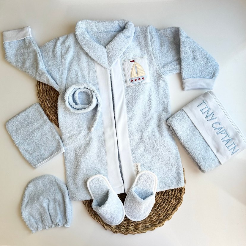 1Yaş 2Yaş 3Yaş Kullanıma uygundur Yumuşak kumaşlı, nakışlı yelkenli detaylı açık mavi erkek bornoz seti. Rahatlık için terlik, havlu ve şapka içerir.