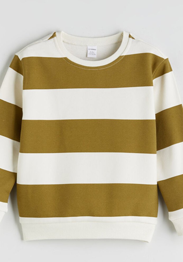 Erkek çocuk için pamuklu, geniş bej ve beyaz çizgili, yuvarlak yakalı ve uzun kollu, rahat kesim sweatshirt.
