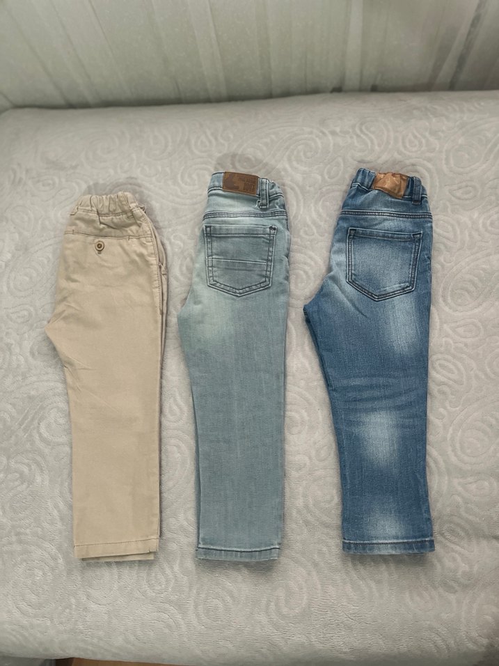 Erkek çocuklar için bej renkli, düzenli kesim denim pantolon, rahat ve şık bir tarz sunar.hepsi 2-3 yaşa uygundur Zara H&M ve LCW ürünleridir