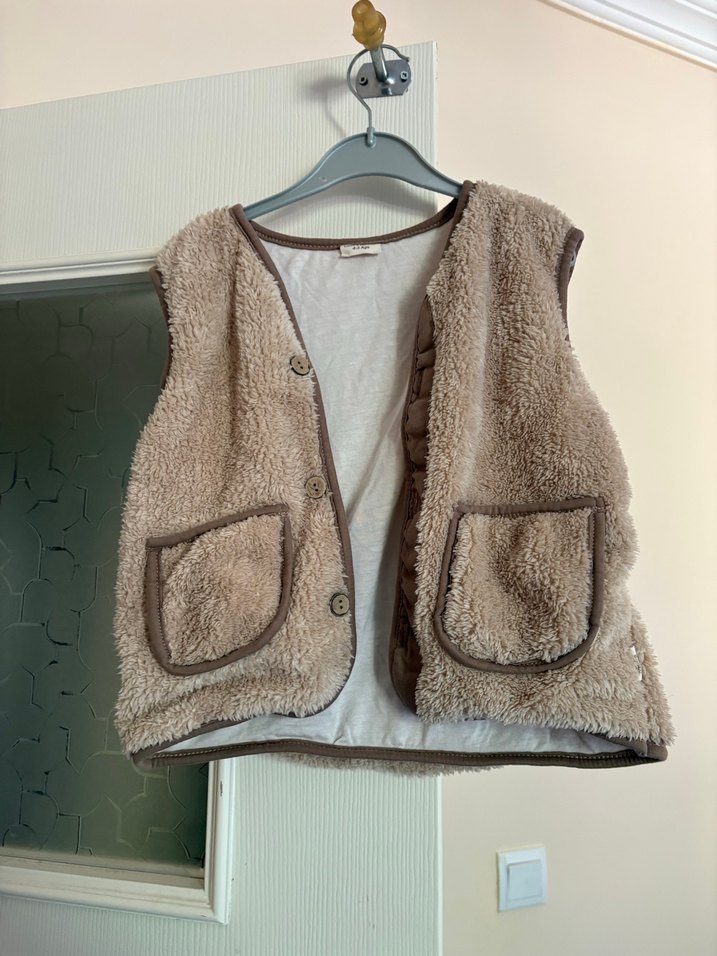 Bej renkli, düğmeli erkek çocuk yeleği, bol kesim ve kolsuz tasarıma sahiptir. Önünde iki cep ve yuvarlak yaka bulunur. Yumuşak ve sıcak kumaştan üretilmiştir.