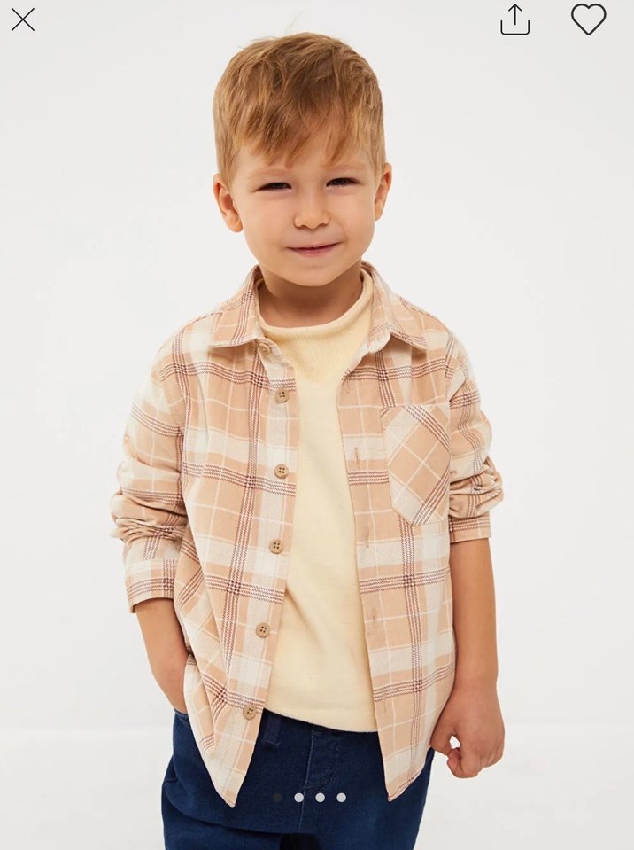 Erkek çocuk için açık bej renkli, pamuklu, uzun kollu, yakalı ve düğmeli gömlek. Hafif tie-dye kareli deseni bulunur. Kadife kumaş