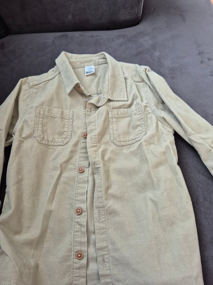Erkek çocuklar için keten kumaştan, bej renkli, düğmeli ve uzun kollu bol kesim gömlek. Çentikli yaka ve iki göğüs cebi bulunur.