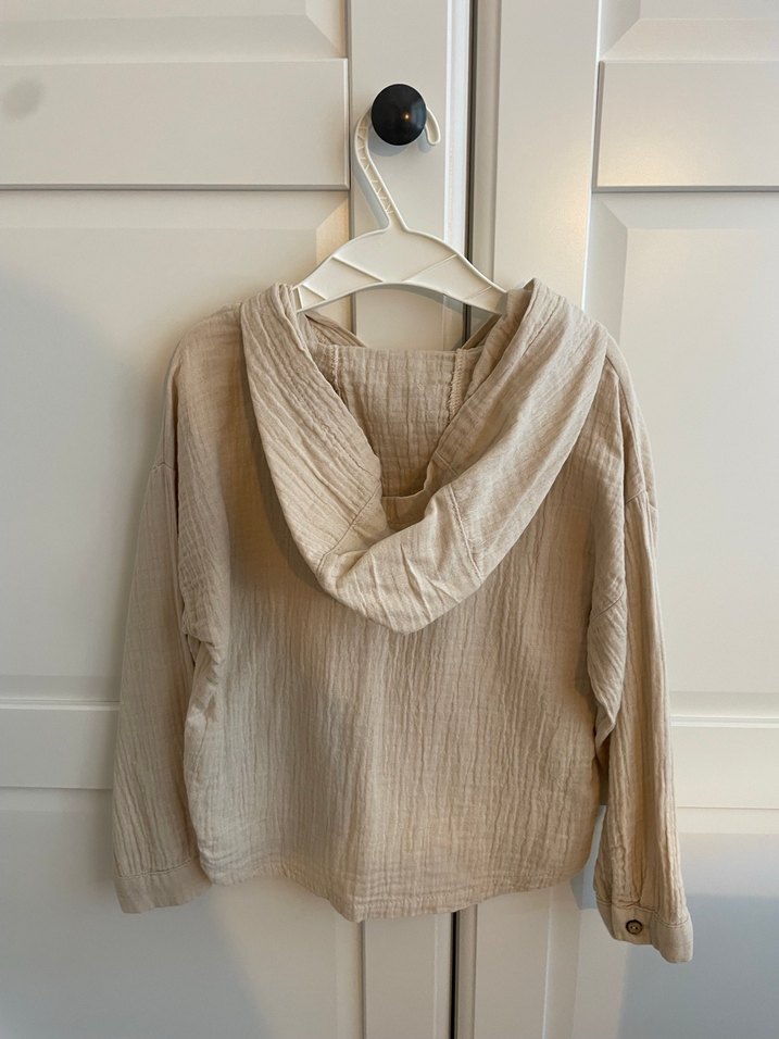 Yumuşak keten kumaştan yapılmış, bol kesim erkek çocuk bej bluz. Uzun kollu, yuvarlak yaka, düğmeli manşetli ve kapüşonludur. Bohem tarzda, sade tasarım.