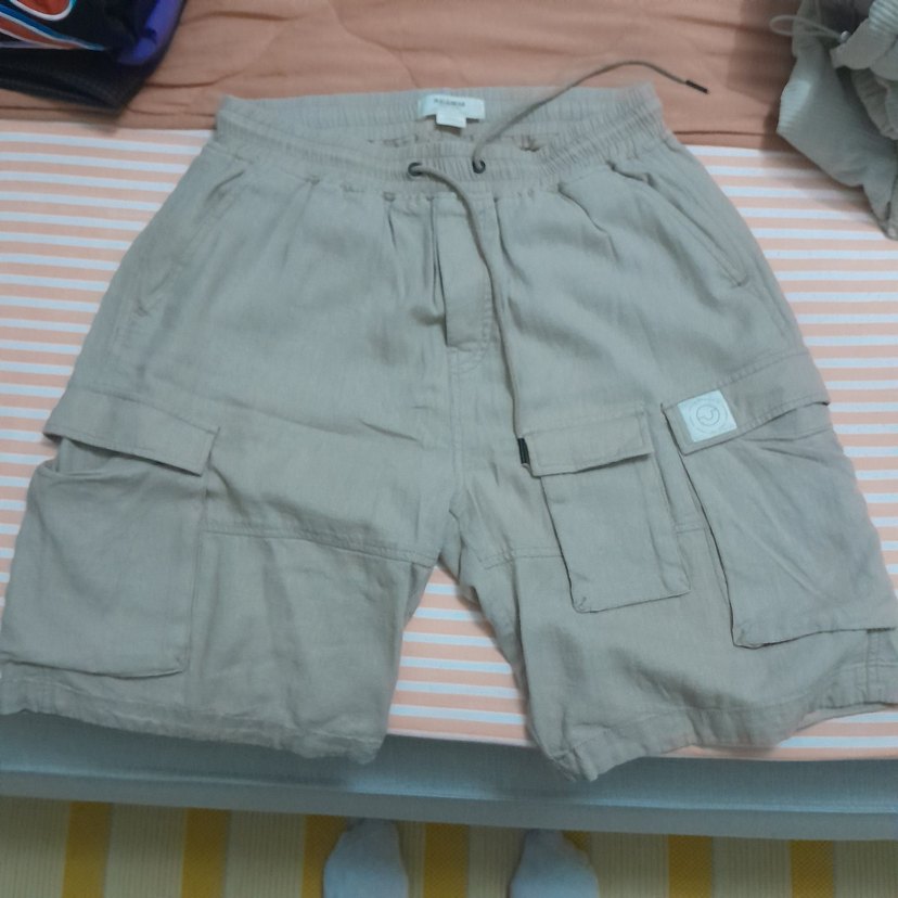 Bej renkli, keten kumaştan, kemerli ve bol kesim erkek çocuk şortu. Kısa boy, çoklu ceplerle dış mekan için uygun rahat şort.