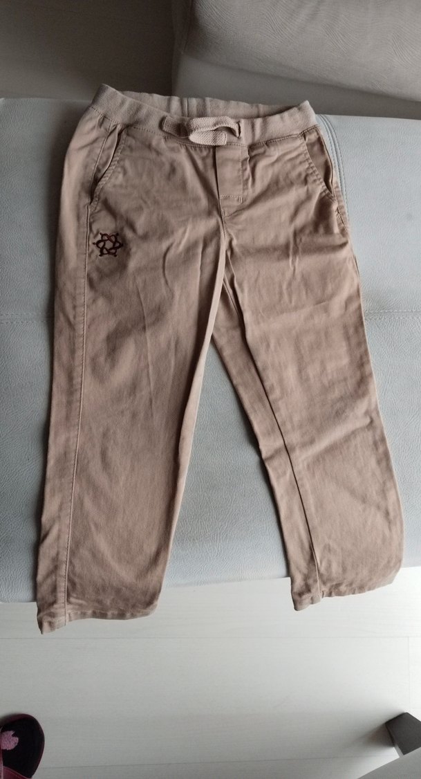 Bej keten kumaştan, rahat kesim erkek çocuk pantolonu. Düğmeli ve yan cepli, küçük nakış detayıyla sokak tarzına uygun. dizde hafif renk açılması var boyda hafif kısaltma yapılmıştı ölçüye ekledim