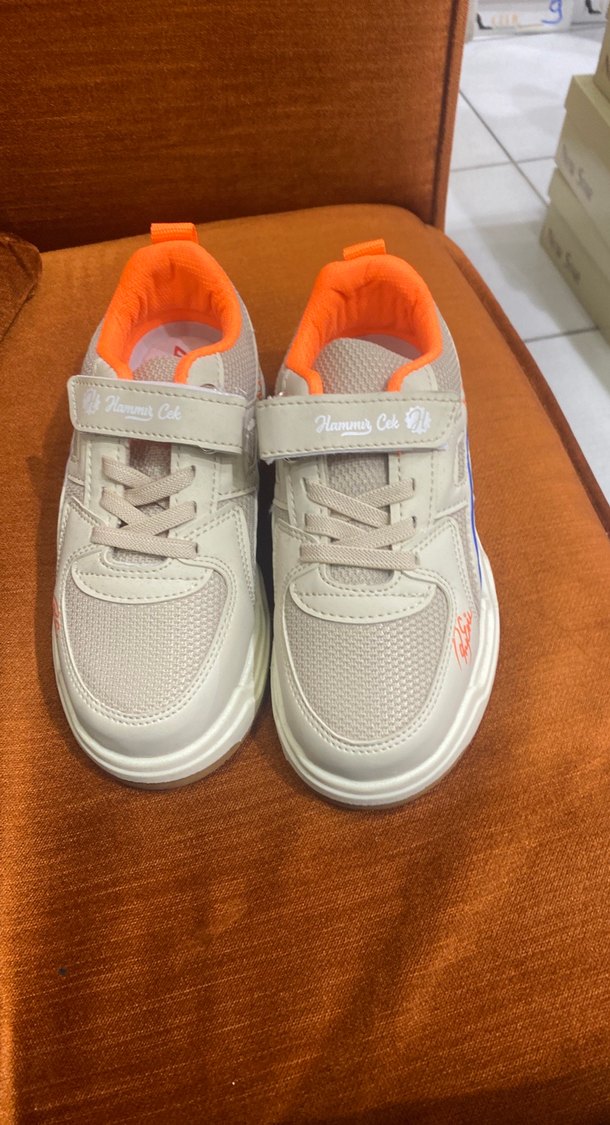 Bej renkli çocuk spor ayakkabısı, Velcro bantlı, baskılı detaylı ve turuncu iç astarlı rahat sokak stili ayakkabı.