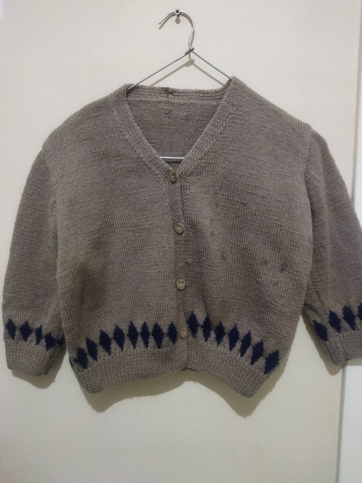 Bej renkli, örme kumaştan yapılmış erkek çocuk hırkasıdır. Uzun kollu ve bol kesimdir. Etek ve kollarında koyu renkli küçük baklava desenleri bulunur.