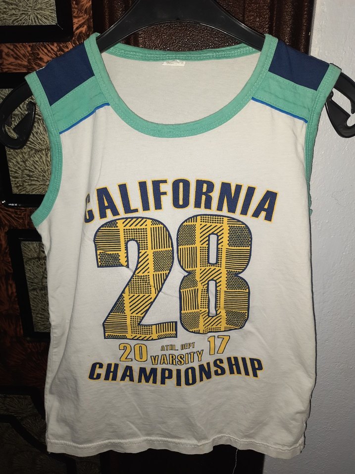 Beyaz pamuklu, kolsuz ve dar kesim erkek çocuk tişörtü. Üzerinde 'California 28 Championship' baskısı ve bisiklet yaka bulunur. arka kısmında minik bi defo var fotoğrafta mevcuttur inceleyebilirsiniz