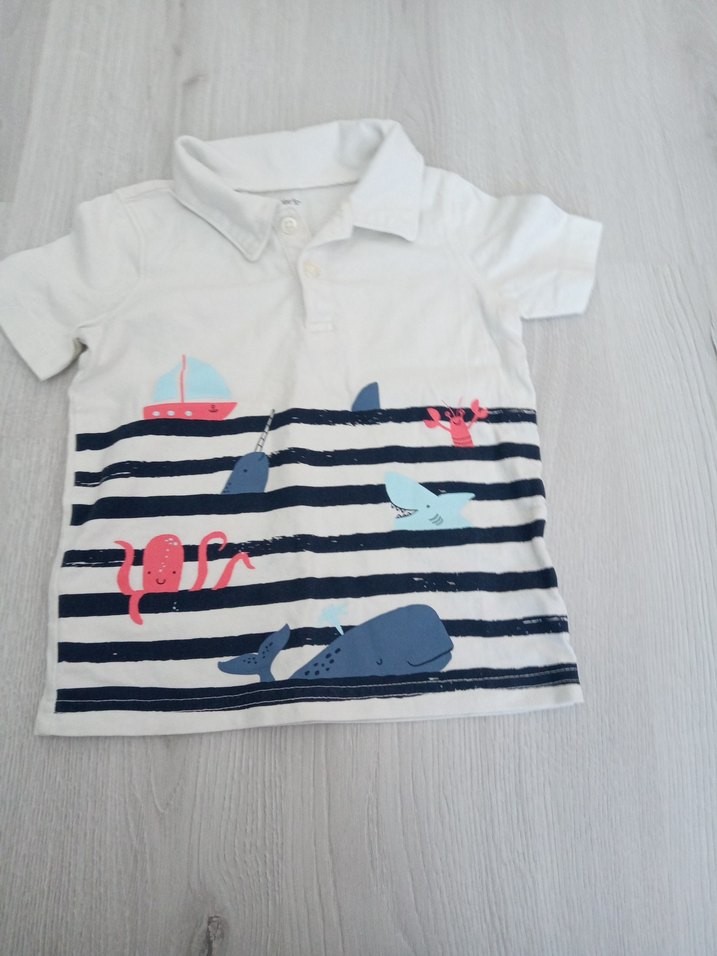 Beyaz, kısa kollu erkek çocuk polo tişörtü. Yaka ve düğmeli ön detaylı, fit kesim. Deniz canlıları baskısı ve lacivert çizgilerle süslenmiş.BG markasının iki kere giyildi