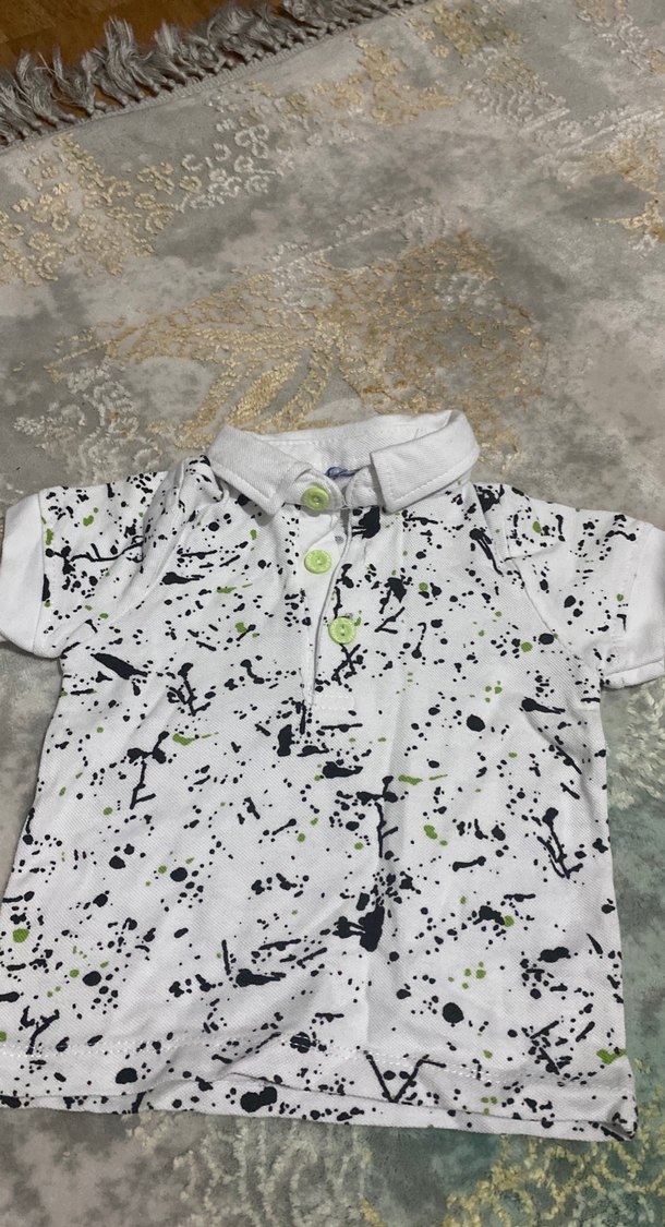 Beyaz renkli, yakalı ve düğmeli erkek çocuk polo tişörtü; rahat kesim ve siyah-yeşil batik desenlidir, sokak modası için uygundur.