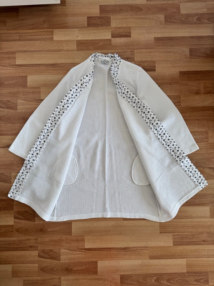 8/10/12 yaşa uygundur etiket S beden Sadece kemeri eksik ve minik bir iz var.Erkek çocuklar için beyaz, deseniz bornoz. Yumuşak ve rahat kumaşa sahip, uzun kollu ve rahat kesimdir.