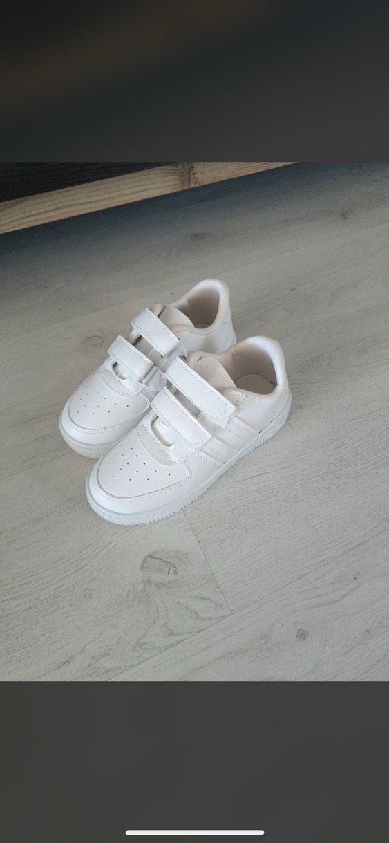 Erkek çocuklar için beyaz, cırt cırtlı ve kauçuk tabanlı spor ayakkabılar, sade ve sokak stiline uygun.