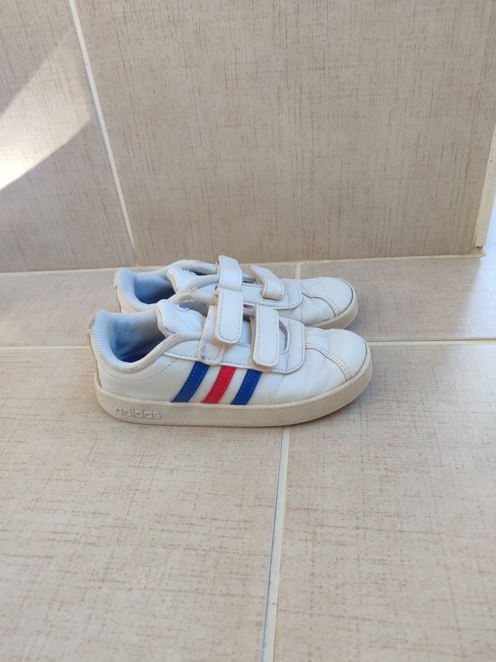Beyaz renkli, cırt cırtlı ve şerit desenli çocuk spor ayakkabısı, kauçuk tabanlı ve sokak tarzına uygun.