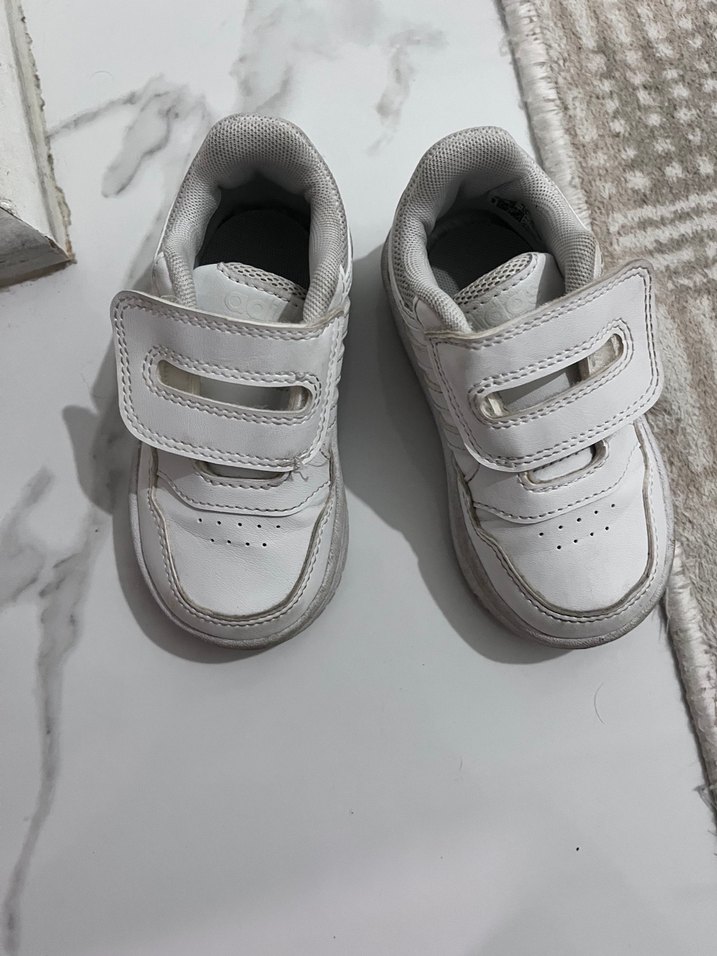 beyaz erkek çocuk spor ayakkabısı, kolay kapanan cırt cırtlı bantlara sahiptir. Düz ve desensiz tasarımıyla dikkat çeker çok kısa süre kullandık hiçbir defosu yoktur
