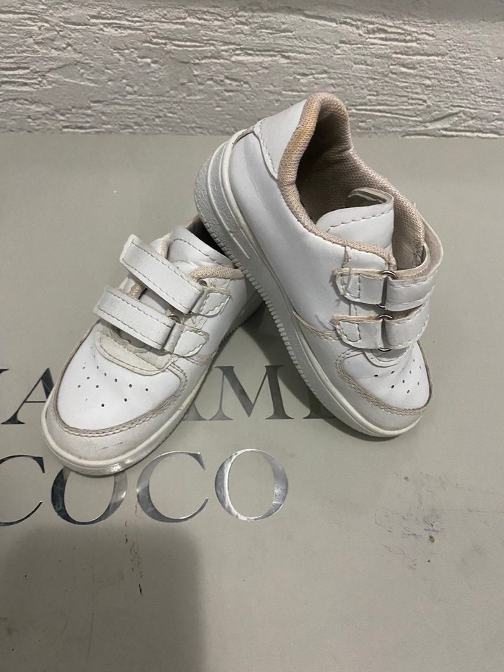 Gri kauçuk tabanlı, beyaz renkli, cırtcırtlı erkek çocuk spor ayakkabısı, sade tasarıma sahip.