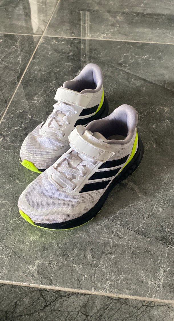 Beyaz, gri ve neon detaylı baskılı erkek çocuk spor ayakkabısı, cırtlı ve kauçuk tabanlıdır. Trendy casual sokak stili için uygundur. 30 numara iki kere giyildi gayet temiz ve orjinal