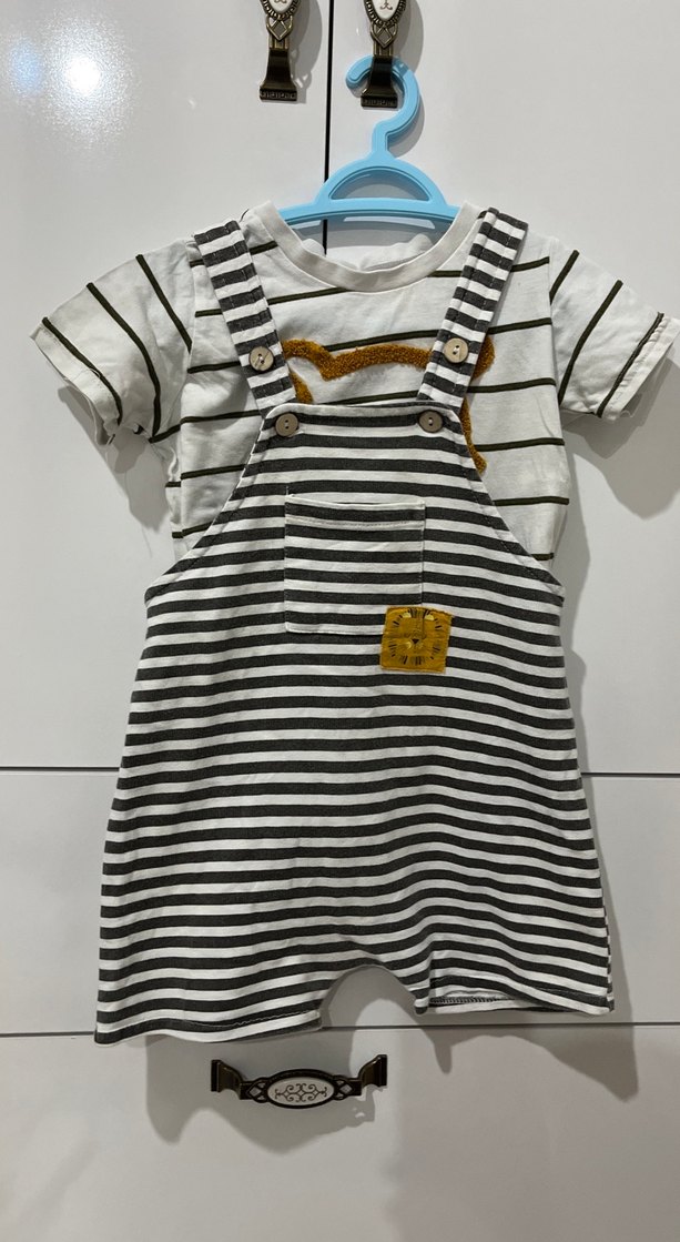 Erkek Çocuk Beyaz Çizgili Ayı Baskılı Tişört salopet takım