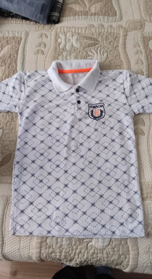 Erkek çocuk için kısa kollu, yakalı ve düğmeli beyaz üzerine gri desenli tişört. Regular fit ve sentetik kumaştan üretilmiştir.