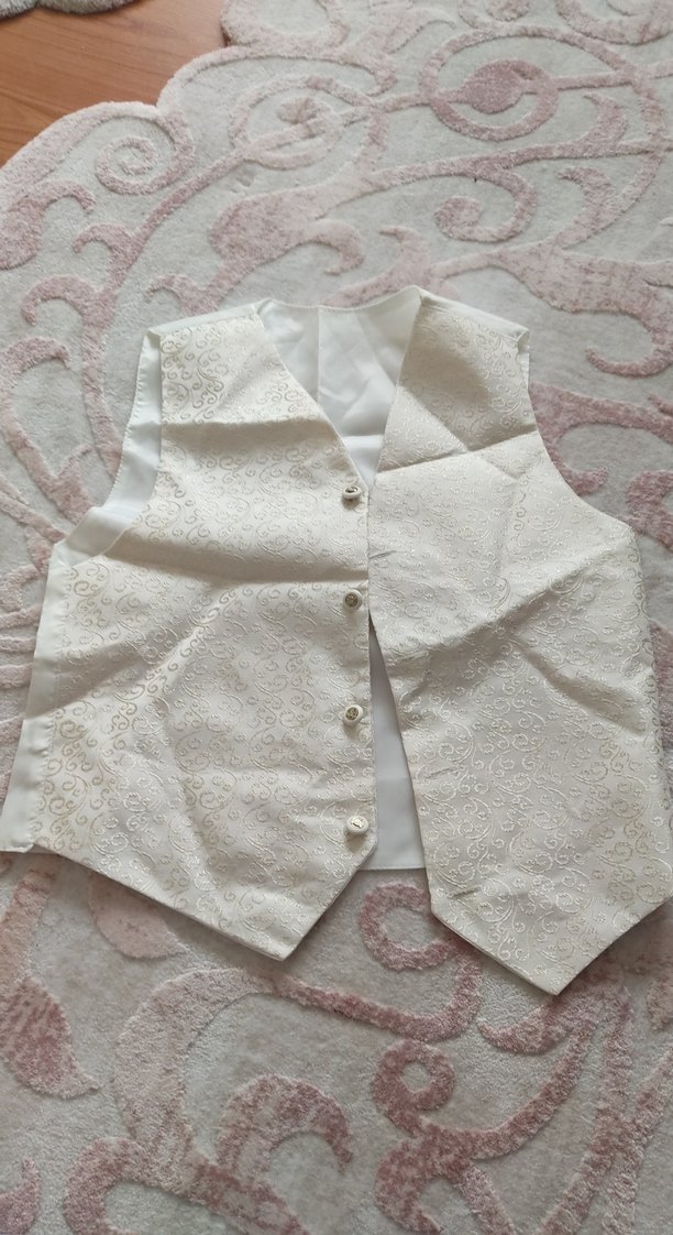 erkek çocukları için düğmeli, yakalı ve kolsuz beyaz yelek. Pastel tonlarda, düz desensiz ve rahat kesimdir. Sentetik kumaştan yapılmıştır.