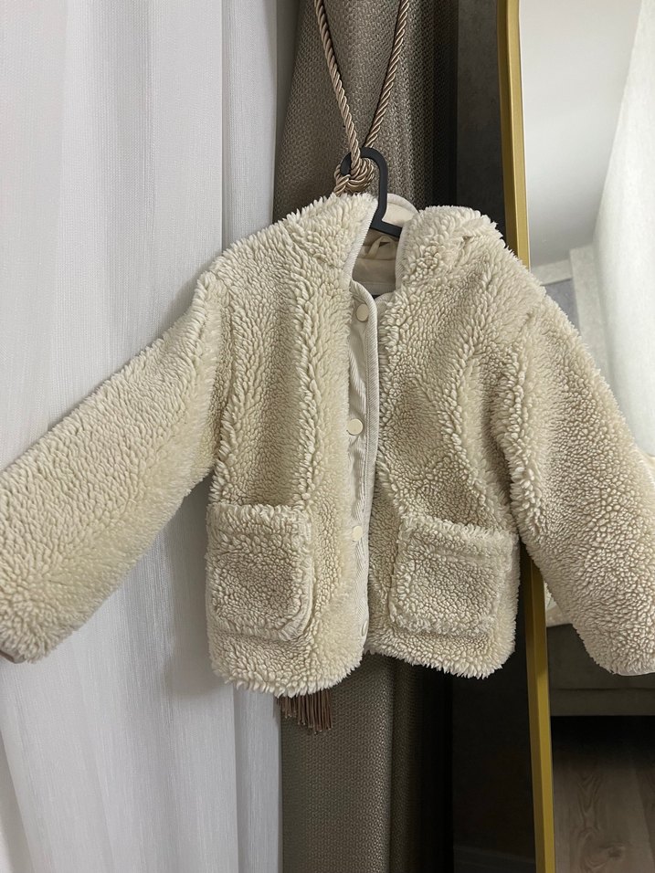 Beyaz, kapüşonlu, peluş kumaştan yapılmış, bol kesim erkek çocuk montu. Ön cepleri ve kürk detayları bulunur. Desensiz ve sade tasarım. 3-4 yaş uyumlu