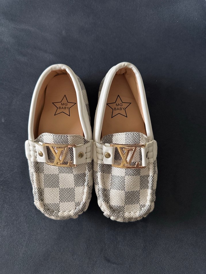 Beyaz, kareli desenli ve tokalı detaylı erkek çocuk loafer ayakkabısı. Yumuşak kauçuk tabanlı, sokak stili için uygun. 26 numara , hiç giyilmemiştir