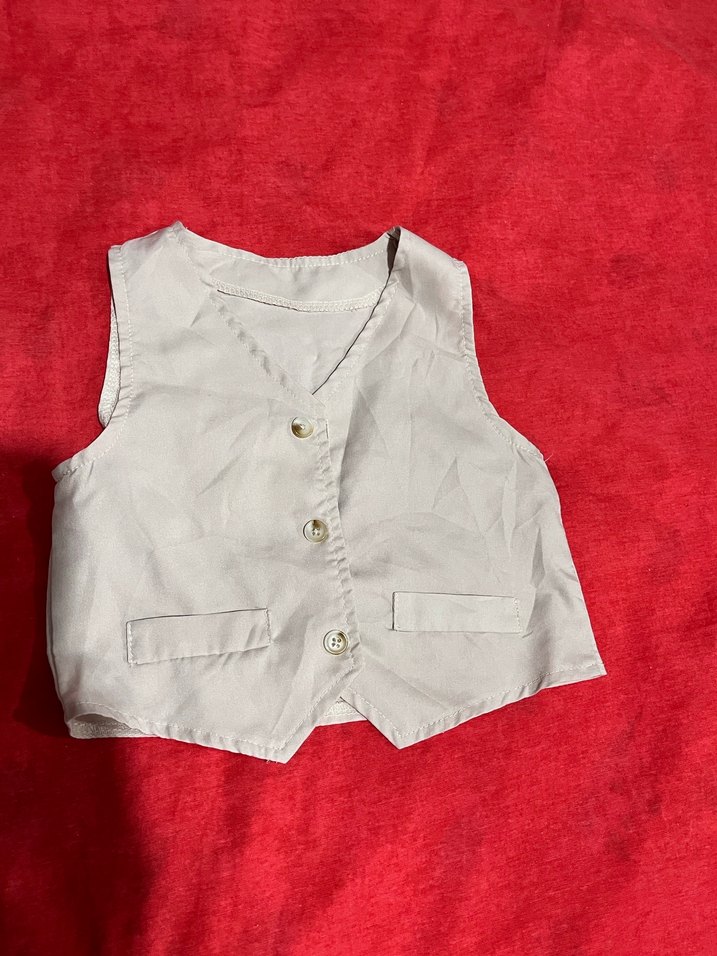 Keten kumaştan, düğmeli ve yakası kesimli, kolu olmayan erkek çocuk beyaz yelek. Rahat kesim ve sade tasarım, sokak stili için uygundur.