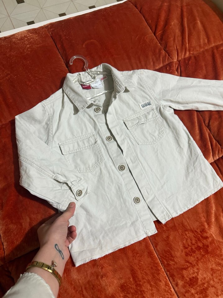 Erkek çocuklar için beyaz keten gömlek, uzun kollu, düğmeli ve çentikli yaka detayına sahiptir. Salaş kesimi ve desensiz tasarımıyla rahat bir görünüm sunar.
