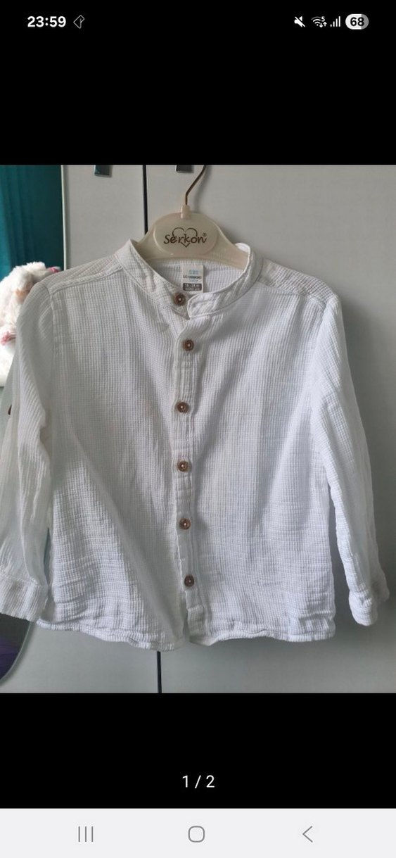 Erkek çocuk için keten kumaştan, düğmeli, uzun kollu, yakalı ve bol kesim beyaz gömlek.
