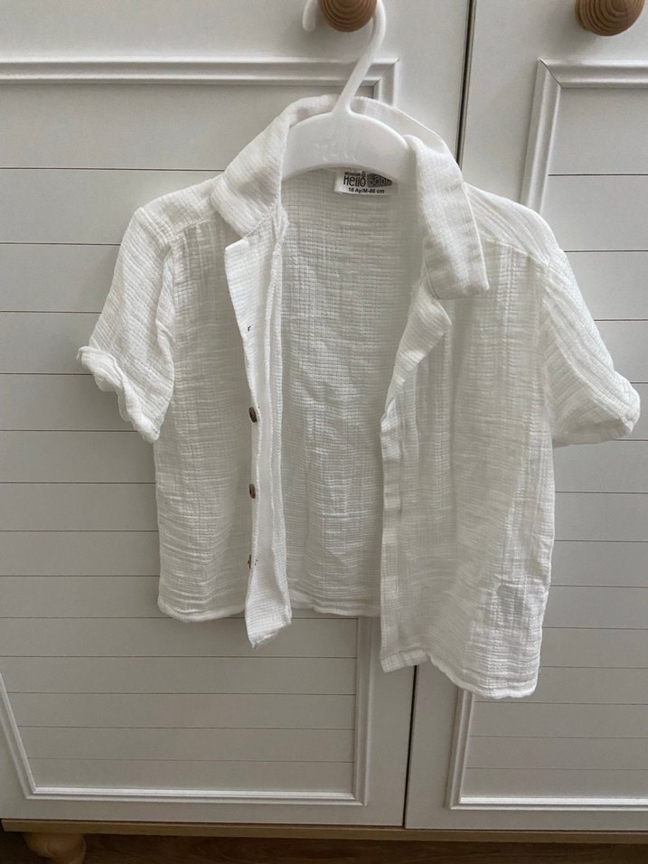 Erkek çocuk için keten kumaştan, kısa kollu ve düğmeli beyaz gömlek. Geniş kesim, yakalı ve desen içermeyen sade tasarıma sahiptir.