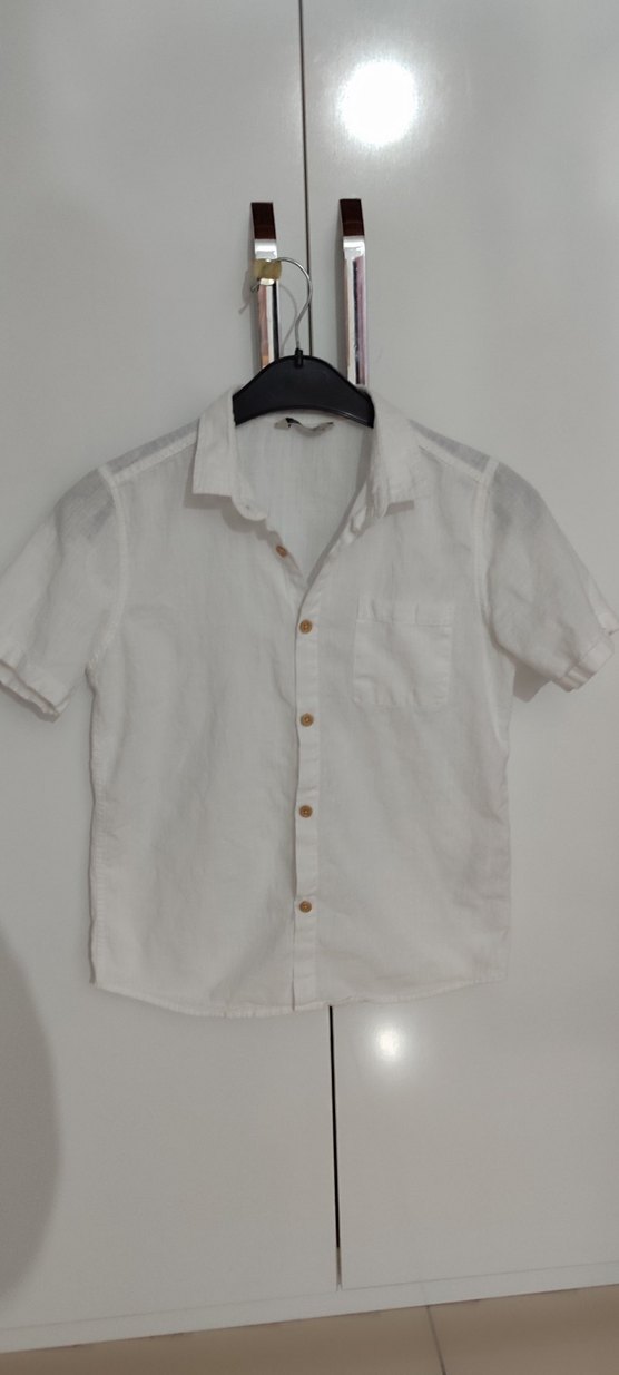 Erkek çocuklar için kısa kollu, düğmeli ve yakalı gömlek. Hafif beyaz keten kumaştan, rahat ve günlük tarz için uygun.