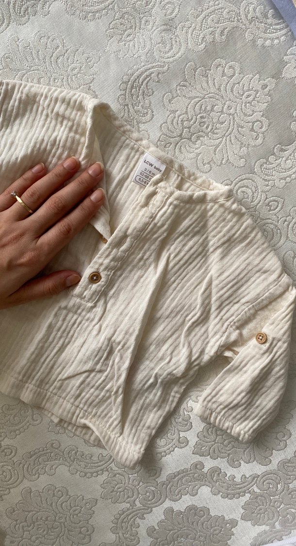 Erkek çocuklar için keten, uzun kollu, salaş kesim beyaz gömlek. Tekne yaka, nakışlı ve düğmeli ön detaylı, bohem tarzda.