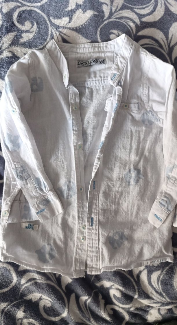 Yumuşak keten kumaştan erkek çocuk için bol kesim, uzun kollu, düğmeli ve yakası kesimli beyaz gömlek. Gri detaylarla bohem tarzında.