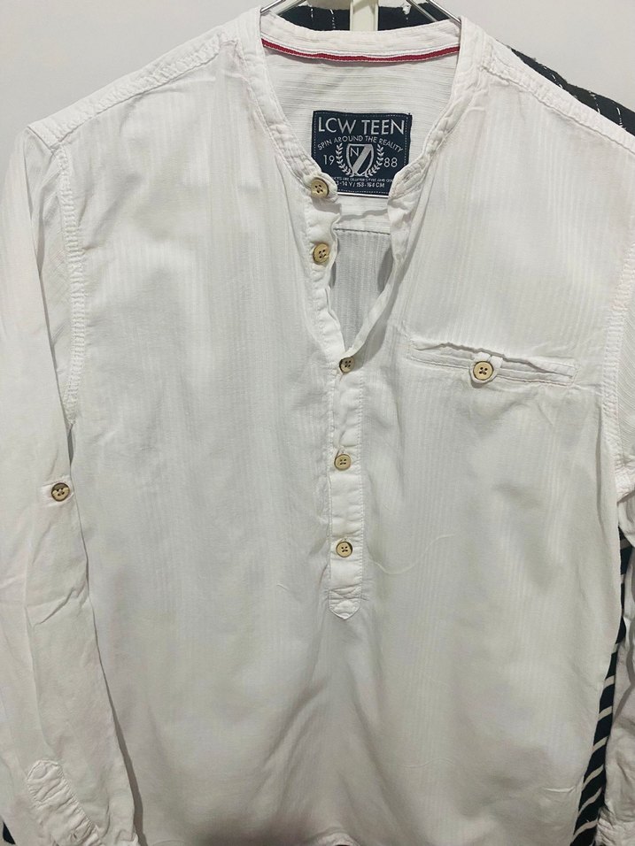 Bir kez kullanıldı.Erkek çocuk için beyaz keten gömlek, düğmeli ön ve kesimli yaka ile. Uzun kollu, bol kesim ve desen içermeyen hafif kumaş, LCW TEEN etiketli.