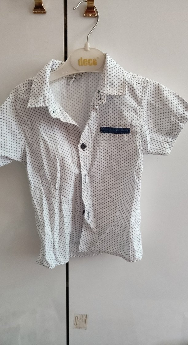 Beyaz renkli, kısa kollu, düğmeli ve yakalı erkek çocuk gömleği. Pamuk kumaştan, mavi baskılı desene sahip, regular fit model, günlük sokak stiline uygun. beden yazmıyor diğer gömlekleriyle ölçtüm 24-36 aylık olanlarla aynı