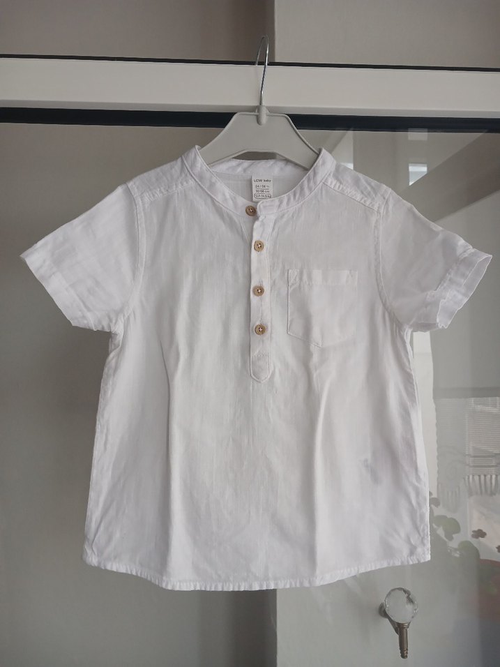 Erkek çocuklar için kısa kollu, düğmeli ve yakalı beyaz pamuk gömlek. resimde isik yansimasindan net cikmasada tam beyazdir Beyaz gomlek iki koltuk alti arasi 31 cm kolaltindan etek ucuna 23cm omuzdan etek ucuna 39cm son resimde gosterdim yaka kisminda ancak cok dikkatli bakildiginda minik leke var olculere bakarak alim yapiniz iade yoktur