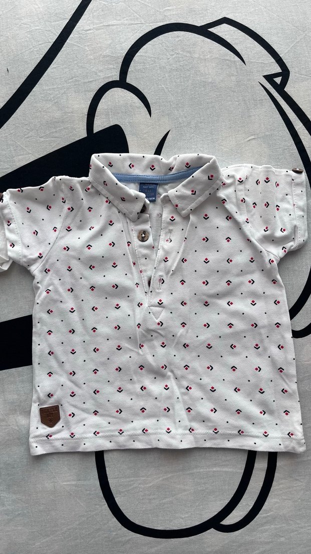 Pamuklu, beyaz renkli, kısa kollu, yakalı ve düğmeli erkek çocuk gömleği. Baskılı desene ve bol kesime sahip, rahat sokak stili için uygun.