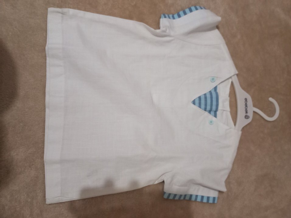 Erkek çocuklar için kısa kollu, düğmeli V yaka gömlek. Pamuk kumaştan üretilmiş, regular fit ve beyaz sade tasarıma sahip, yakada ve kollarda ince çizgili detaylar bulunur.