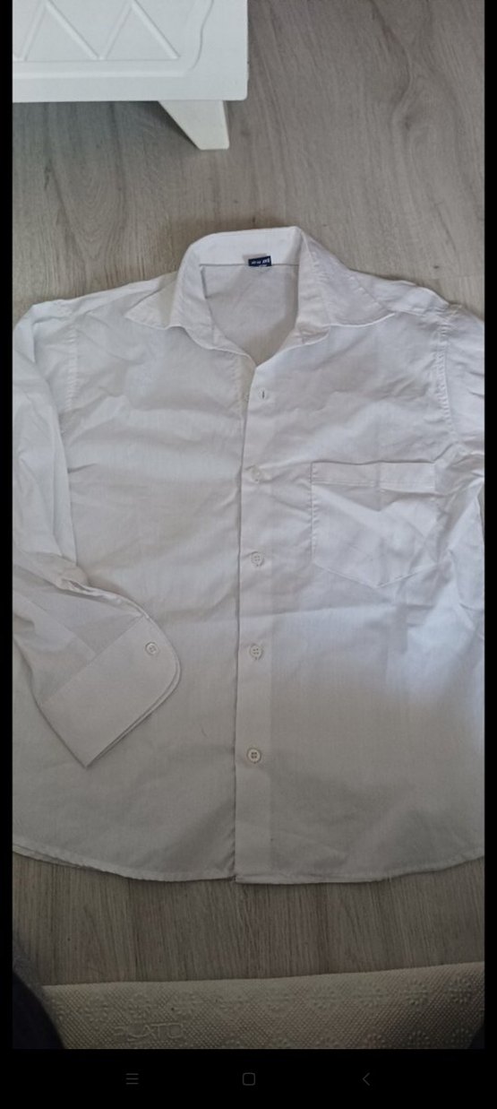 Beyaz keten kumaştan yapılmış, yakalı ve düğmeli erkek gömleği. Uzun kollu ve normal kesim,
