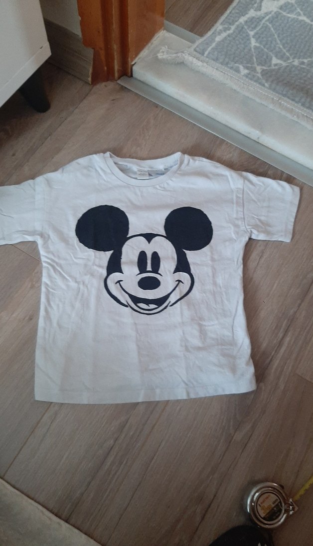 Erkek çocuk tişörtü, pamuklu kumaştan, bol kesim ve kısa kollu. Önünde büyük baskılı Mickey Mouse yüzü bulunur. bir kaç kez giyildi.en 33 boy 42