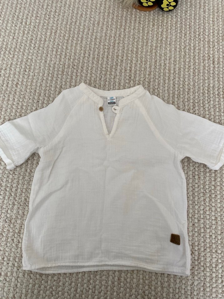 Erkek çocuklar için müslin kumaştan, V yakalı, düğmeli, kısa kollu ve bol kesim beyaz gömlek. Bohem tarzda sade tasarım.