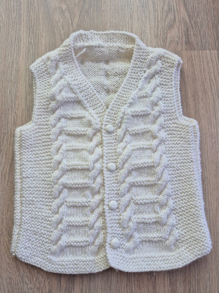 Beyaz renkli, örgü kumaştan yapılmış erkek çocuk süveteri. V yaka ve düğmeli, kolsuz tasarıma sahiptir. Rahat kesimli ve sade bohem tarzda.