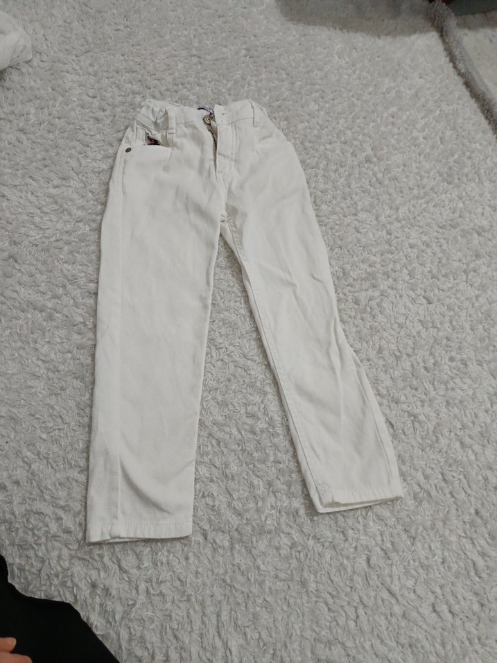 Pamuklu, düğmeli, beyaz erkek çocuk bol pantolon. Desensiz ve sade tasarıma sahip.